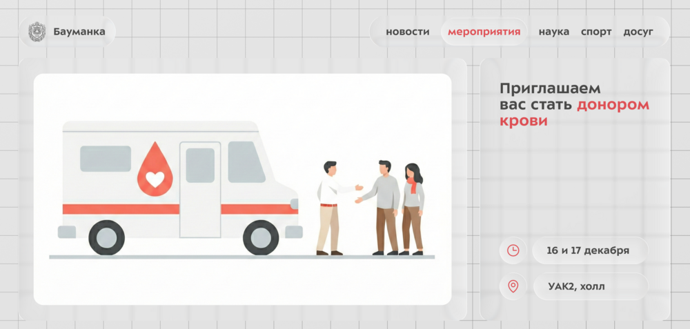 Донорская акция пройдёт 16 и 17 декабря с 8:30 до 13:30 на первом этаже в УАК2. При себе необходимо иметь оригинал паспорта и студенческий билет.