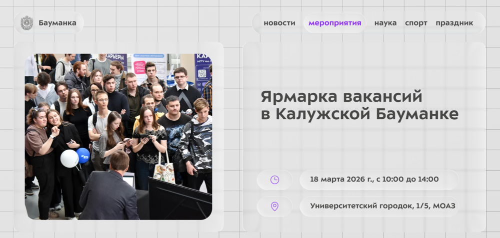 18 марта кампус Калужского филиала МГТУ им. Н.Э. Баумана превратится в точку притяжения для студентов и лучших работодателей региона. Более 70 предприятий Калужской области представят вакансии и стажировки для студентов всех курсов и выпускников.